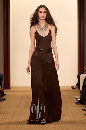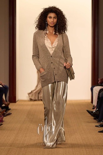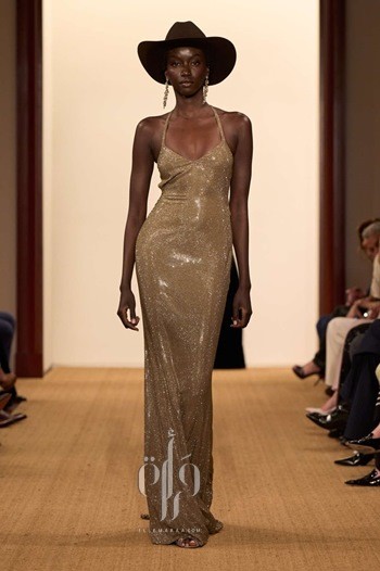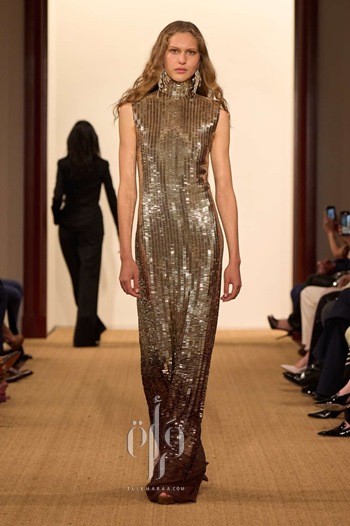 ينتقل Ralph Lauren إلى السحر الأمريكي وأناقة نجمات هوليوود التي لم تغب عن ذهنه إذ يكشف عن مجموعة من فساتين السهرات البراقة، فنجد الفستان الميدي الميتالك مع الشراريب ينسقه مع الكارديغان الصوف، فستان طويل فضي من الباييت، وفستان من قماش الجورجيت الحريري يزدان بتطريزات الخرز اللامعة.