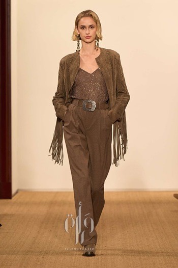 اعتمد Ralph Lauren لوحة ألوان ترابية من البني والبيج مستوحاة من الصحراء الأمريكية مع إضافات رمادية مغبرة والأسود الكلاسيكي.