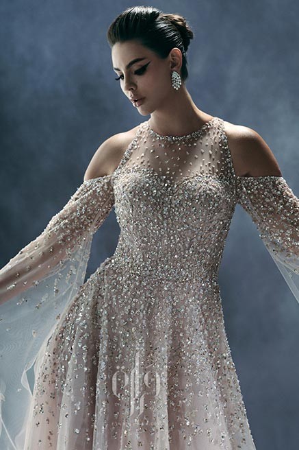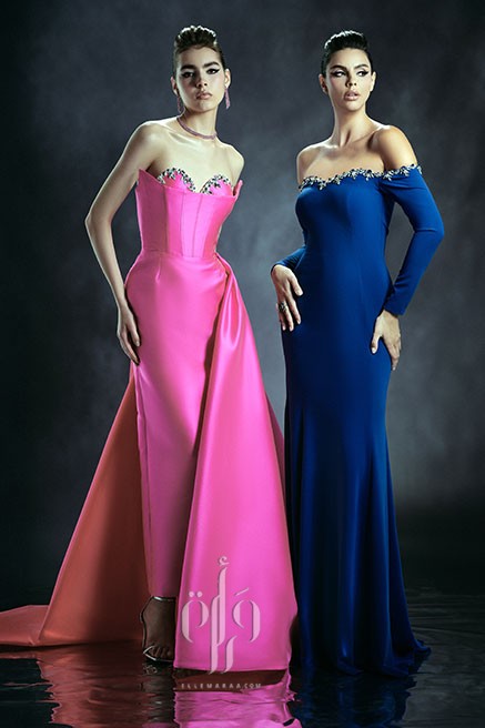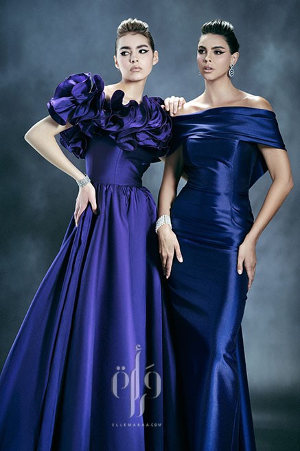 ويتعزّز هذا الجانب بأقمشة الـ«Mikado» التي استخدمها المصمم ساهر ضيا، إضافة إلى أقمشة الـ«تافتا» التي تزيد الإطلالة بريقاً، كذلك أقمشة الـ«تول» Tulle التي تضفي جرأة وأنوثة على التصاميم، وقد أدخل «الكورسيه» الى جميع التصاميم.