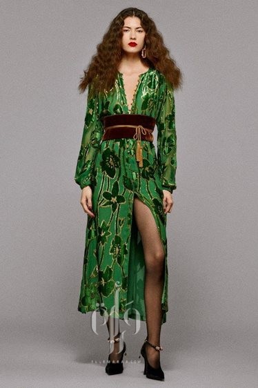 ظهرت التصاميم بأسلوب يوازن بين الأناقة والتفرد، أبرزها فستان حريري بألوان الطبيعة مثل الأزرق المائي والأخضر الغامق، مع تفاصيل دانتيل برونزية، وحزام أوبّي مخملي أضاف تميزًا للتصميم.