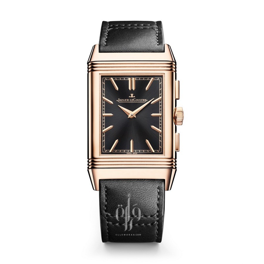 The Reverso Tribute Chronograph, features an hour-minute display on its two dials with contrasting and complementary styles. The front dial displays the aesthetic codes of the Tribute line: gadroons, “railroad” minute track, applied hour-markers and Dauphine hands stand out against the sunray black dial.