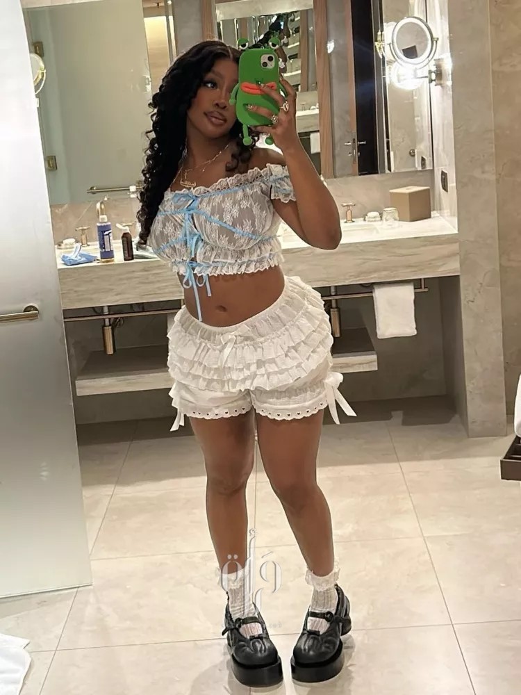 Skort دانتيل أو مزين بالكشكش مع بلوزة مطابقة لإطلالة لافتة على طريقة SZA، ونسّقيها مع أحذية Mary Janes العالية.