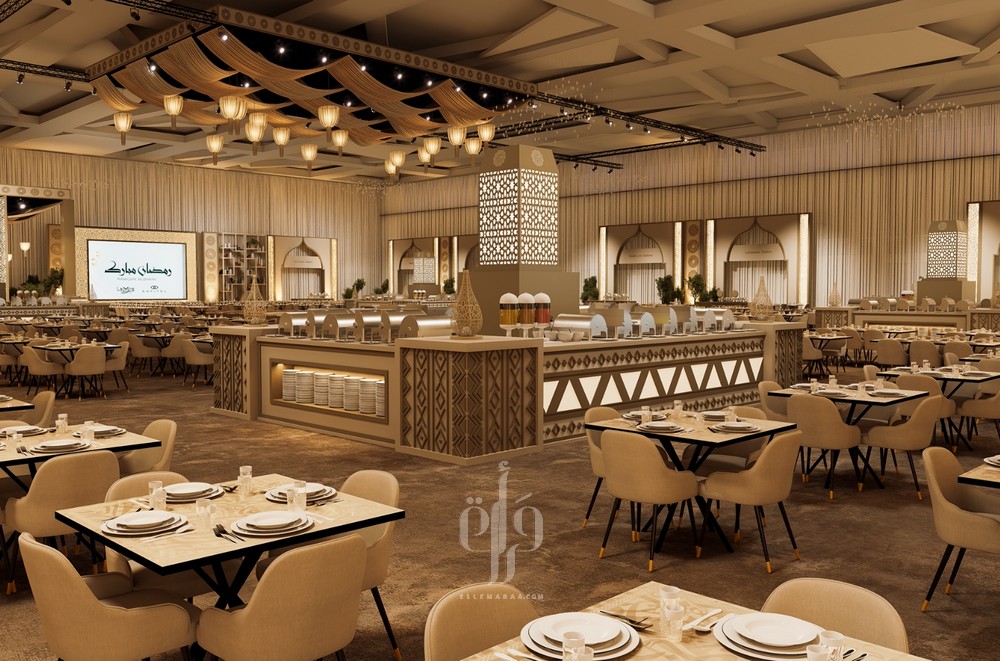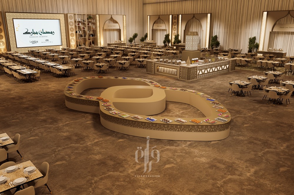 تستوحي خيمة ليالي سوفيتيل الرمضانية تصميمها من روح المجلس السعودي الأصيل، في رؤية عصرية راقية تجسّد مزيجاً متناغماً من الفخامة والحداثة. تمتزج في تفاصيلها عناصر الأصالة السعودية مع اللمسة الفرنسية الراقية التي تميّز فندق سوفيتيل، حيث تظهر الأقواس العربية، والزخارف الهندسية، والإضاءة الدافئة، وتدرجات السقف الانسيابية، والمجسّمات الرمضانية الفنية، ولوحة الألوان المستوحاة من درجات الصحراء، لتخلق أجواءً ترحيبية ساحرة تنبض بروح الشهر الفضيل.