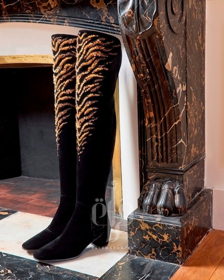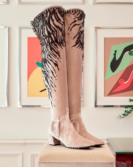 • Cuissardes مطرّزة بأبازيم وكعب منخفض، تقدم إحساسًا أكثر حميمية ودفئًا.
